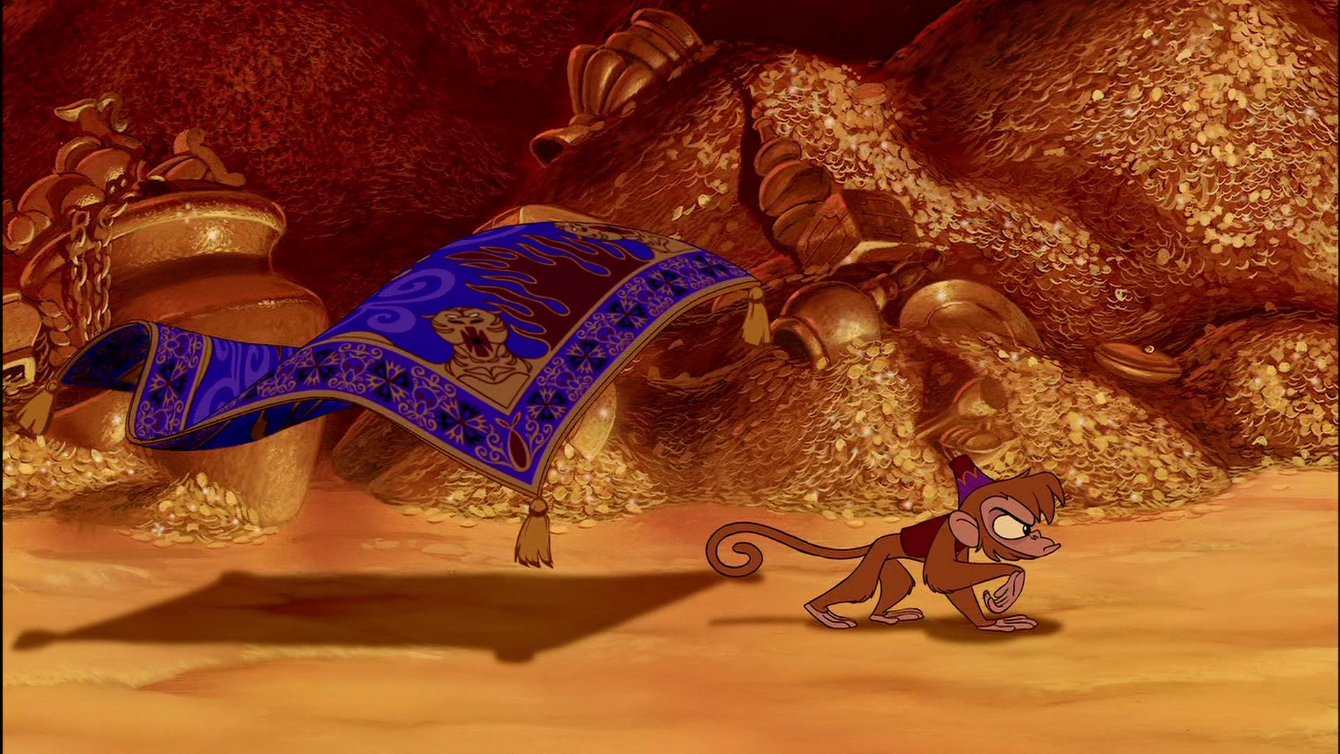 Também presente em adaptações anteriores, mas de forma menos cativante, o Tapete Mágico foi incorporado como uma espécie de substituto ao Gênio do Anel; animado por Randy Cartwright, que mantinha um pedaço de pano dobrado como referência para as posições assumidas pelo objeto animado, o personagem foi considerado um desafio para o desenhista, já que expressava-se através da pantomima, sem apresentar traços humanos ou animalescos; "É uma espécie de atuação através do origami" comenta.